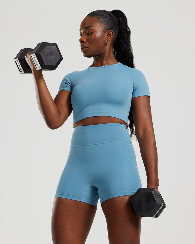Crew neck short sleeve tee with a cropped hem that sits just above the waistline for a flattering silhouette.